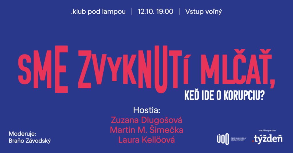 Aj na tieto otázky budeme hľadať odpovede v diskusii s investigatívnou novinárkou Laurou Kellöovou, publicistom Martinom M. Šimečkom a predsedníčkou Úradu na ochranu oznamovateľov Zuzanou Dlugošovou.
